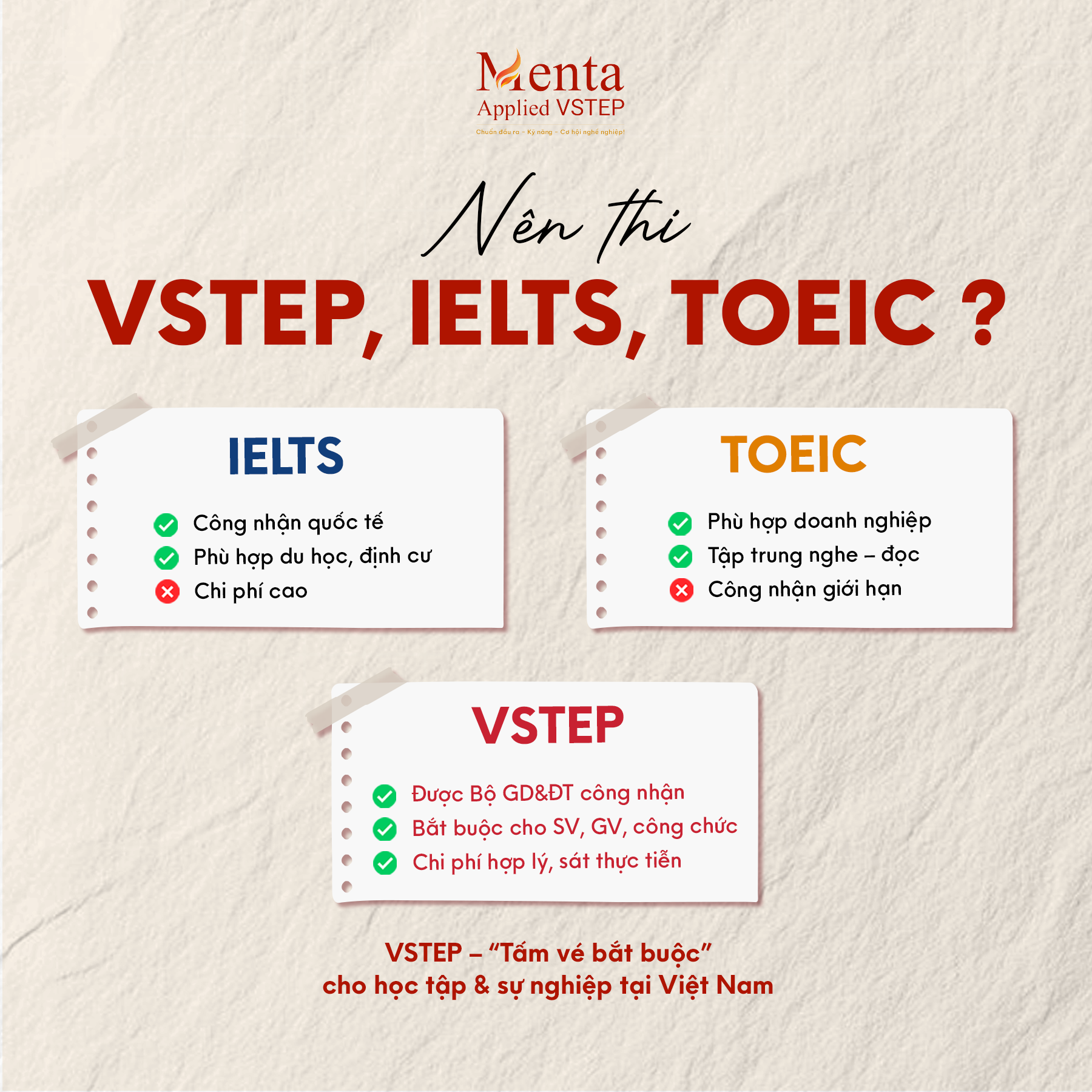 Trước khi quyết định thi chứng chỉ nào, điều quan trọng nhất là xác định rõ mục tiêu của bản thân. Nếu bạn cần một chứng chỉ được công nhận chính thức trong nước, phục vụ học tập và sự nghiệp lâu dài, thì VSTEP chính là lựa chọn không thể bỏ qua. Và trên hành trình đó, MENTA VSTEP – Trường Đào Tạo VSTEP Ứng Dụng sẵn sàng đồng hành, giúp bạn biến lựa chọn đúng hôm nay thành lợi thế bền vững trong tương lai.