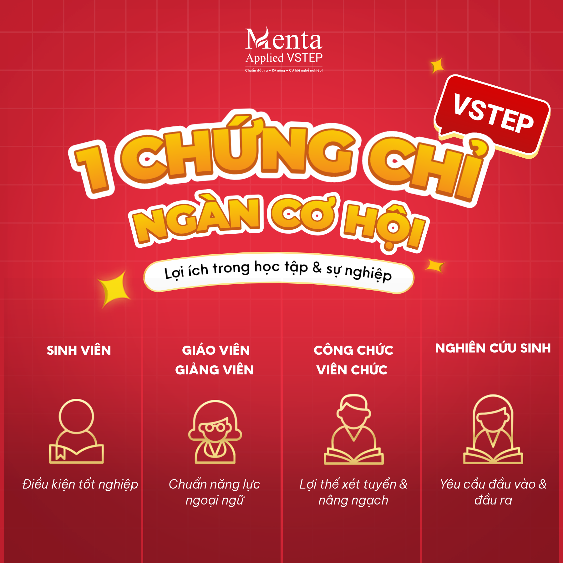 Chỉ một chứng chỉ, nhưng mang lại hàng ngàn cơ hội: từ học tập vững vàng, sự nghiệp rộng mở cho đến khẳng định vị thế bản thân trong môi trường cạnh tranh. Đồng hành cùng người học trên hành trình đó, MENTA VSTEP – Trường Đào Tạo VSTEP Ứng Dụng không chỉ cung cấp kiến thức mà còn tập trung vào tính ứng dụng, giúp học viên tự tin chinh phục kỳ thi và sử dụng tiếng Anh hiệu quả trong thực tế.