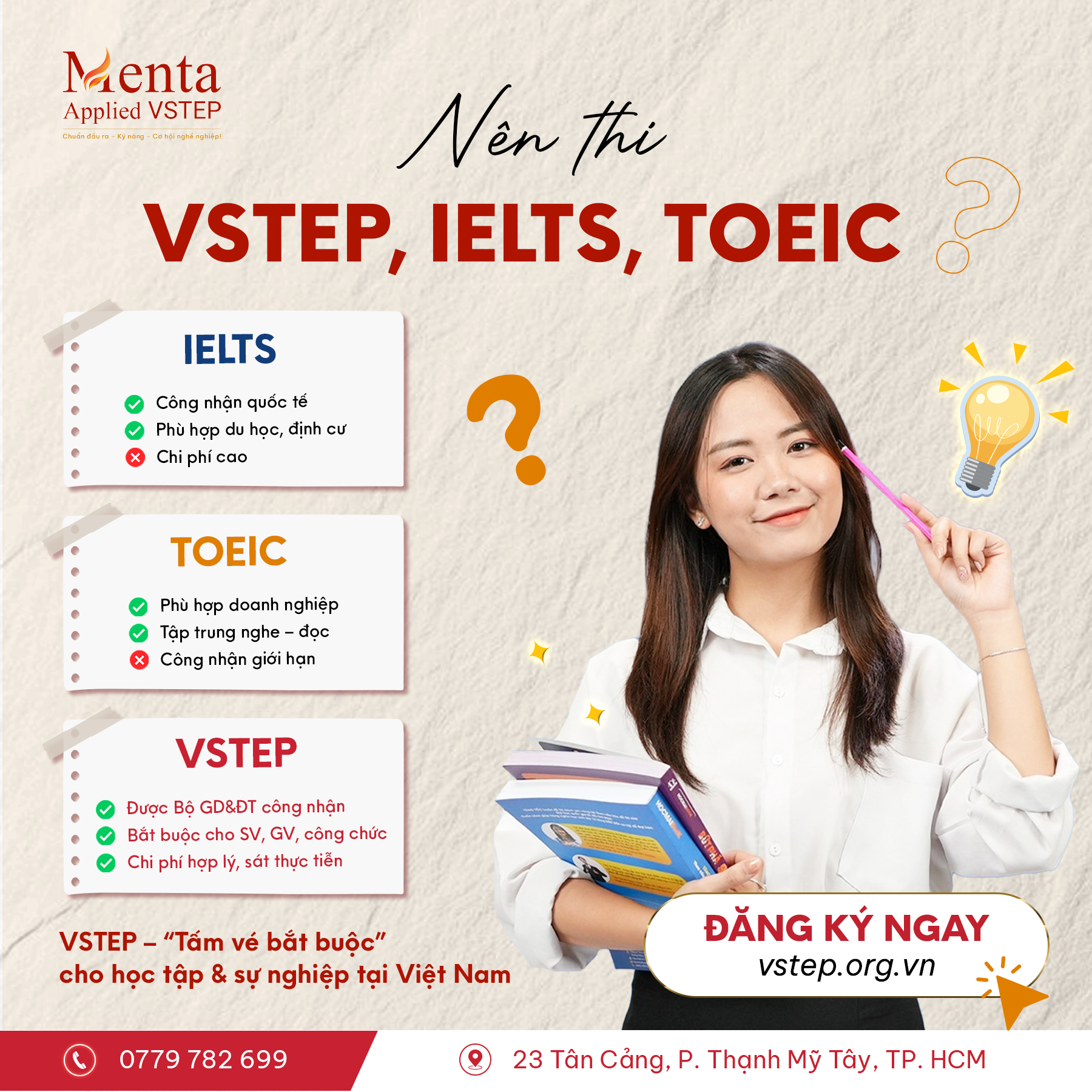 Trước khi quyết định thi chứng chỉ nào, điều quan trọng nhất là xác định rõ mục tiêu của bản thân. Nếu bạn cần một chứng chỉ được công nhận chính thức trong nước, phục vụ học tập và sự nghiệp lâu dài, thì VSTEP chính là lựa chọn không thể bỏ qua. Và trên hành trình đó, MENTA VSTEP – Trường Đào Tạo VSTEP Ứng Dụng sẵn sàng đồng hành, giúp bạn biến lựa chọn đúng hôm nay thành lợi thế bền vững trong tương lai.